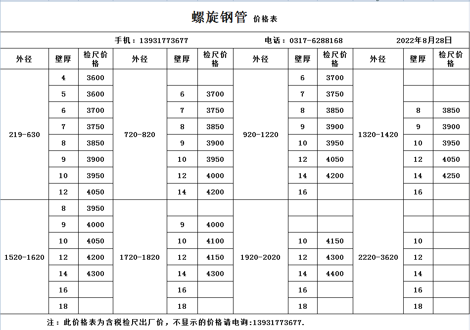 螺旋鋼管價格表2020年8月28日